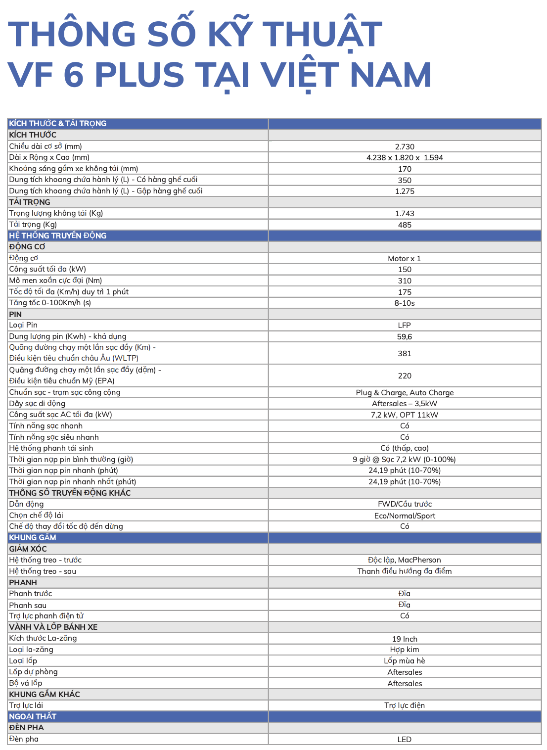 Cả hai phiên bản của VF 6 đều được trang bị pin LFP dung lượng 59,6 kW với phạm vi hoạt động tương ứng là 399 km và 381 km (theo tiêu chuẩn WLTP) cho một lần sạc đầy. Xe sử dụng động cơ điện có công suất tối đa 100 kW và 150 kW, tương ứng với mô-men xoắn cực đại 135 Nm và 310 Nm, cho cảm giác lái hứng khởi và dễ dàng đáp ứng nhu cầu di chuyển của mọi khách hàng.